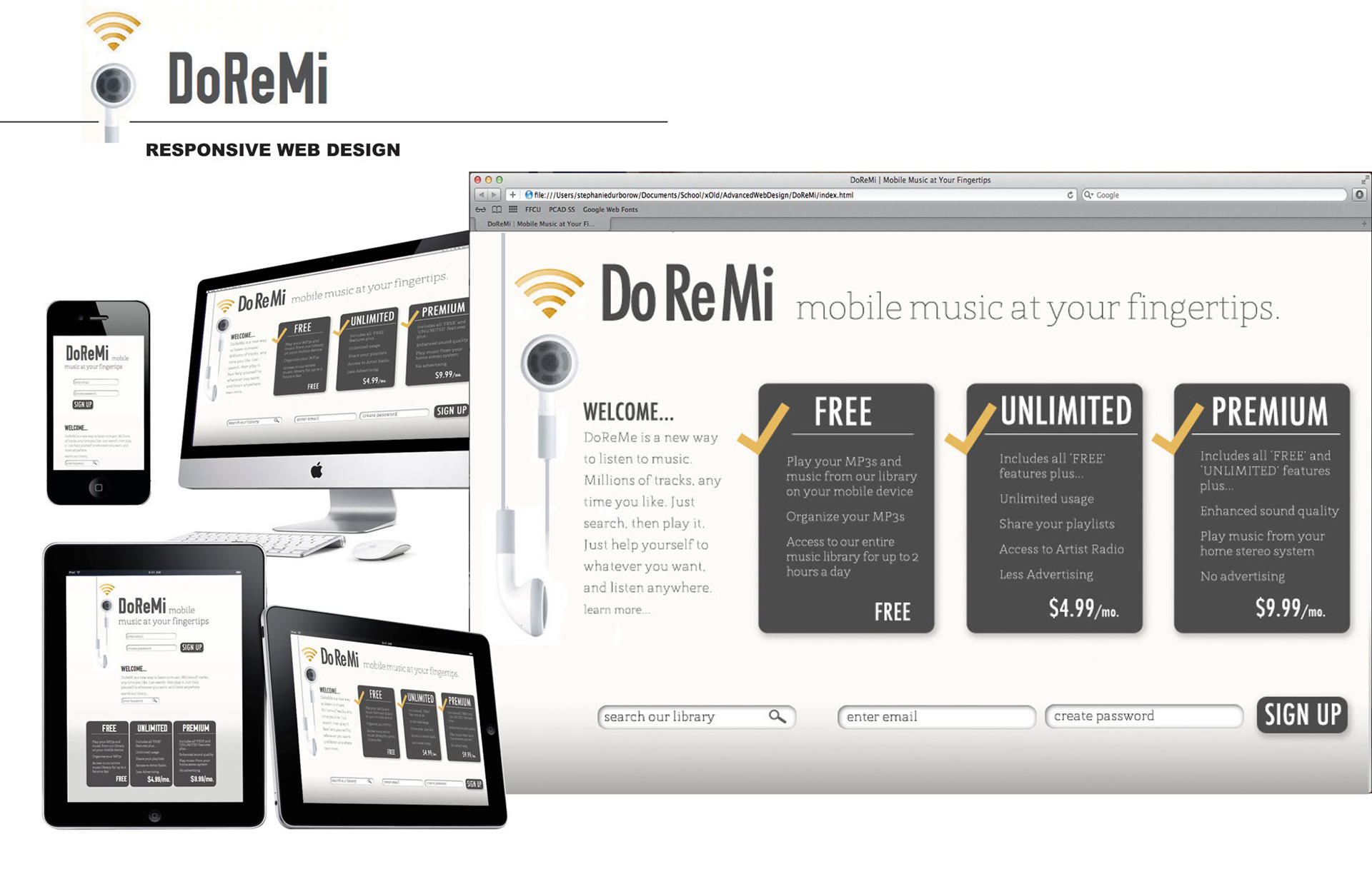 This design was created as an assignment for a hypothetical music streaming service to practice using Photoshop, HTML & CSS Coding for front-end responsive web design. Using imagery of the current technology of the time I decided to use the apple headphone images and a clean, sleek feel for the site home page. Copywriting is original, buttons, search and login fields were functional. I created a quick logo using a clean san-serif font and the created 'sound icon' with a gradient to invoke the feel of an apple icon, going along with the digital 'techy' theme that I felt the project demanded.